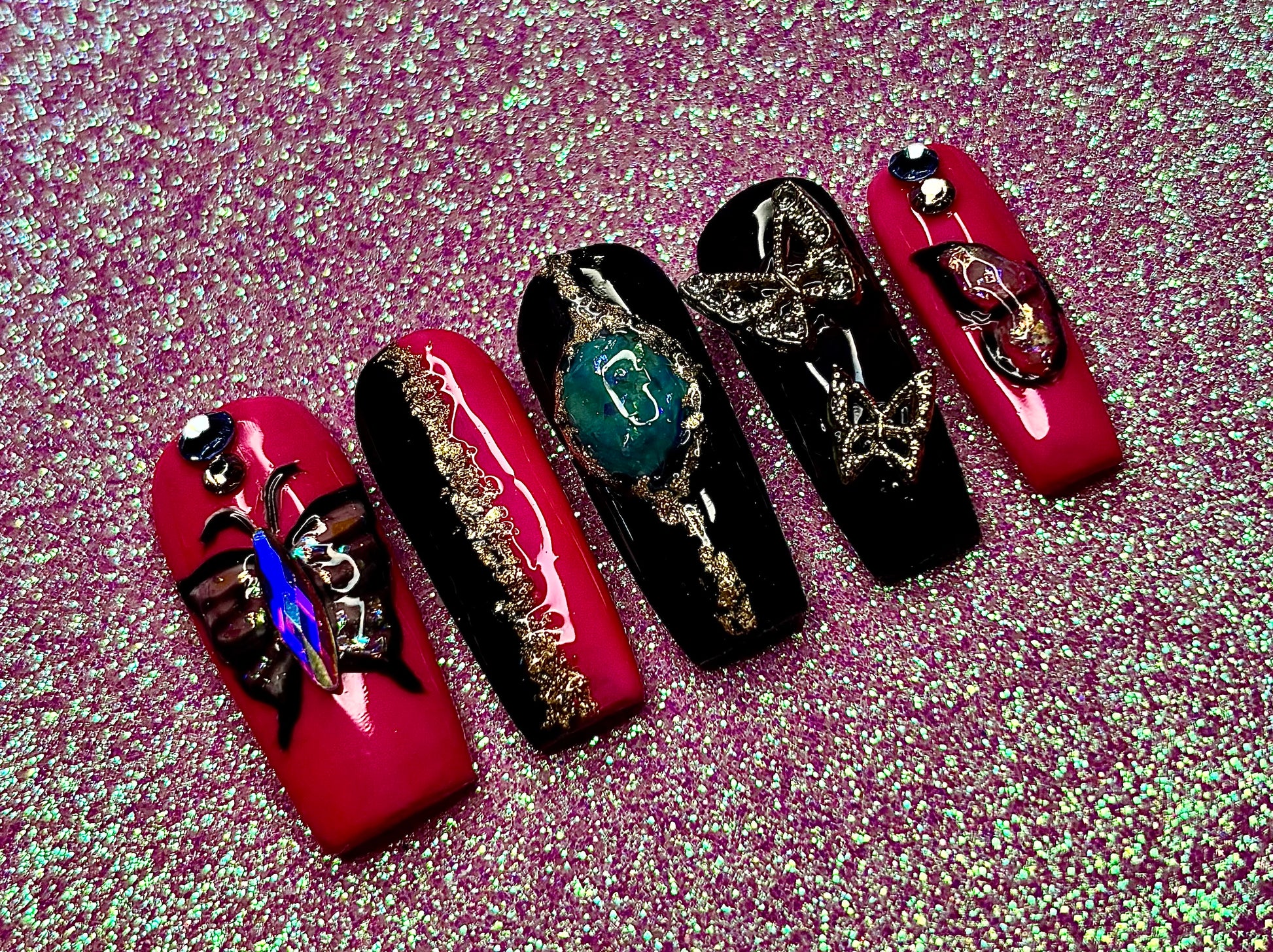 Hot pink and black glossy nail set displaying beautiful 3d butterflies and a 3d stone- like element on the middle finger.
